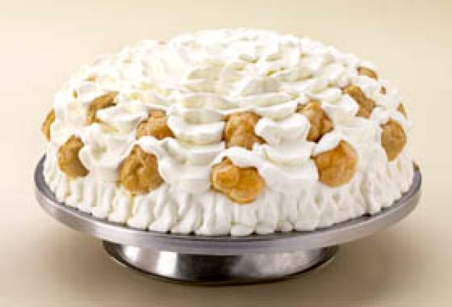 Sportskagen består af knust nougat, flødeskum, makronbund og karamelliserede vandbakkelser.