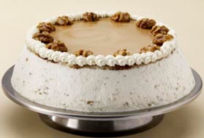 Valnøddelagkagen består af knuste valnødder i flødeskum, mandelbunde og mokkaglasur. Pyntet med karamelliserede valnødder.